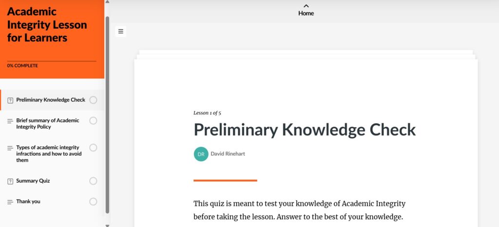 I encourage people to tailor the lesson to their institutions and to share with students. The aim is to help students avoid academic impropriety and to work together with their institution to uphold the integrity of their degrees. This can be directly implemented into an LMS and can be altered using the Articulate Rise tool. The way it was implemented at my institution was by making the lesson a requirement before students could submit their first CA. The hope is that the lesson will help guide students away from academic improprieties and to reduce cases of academic impropriety.