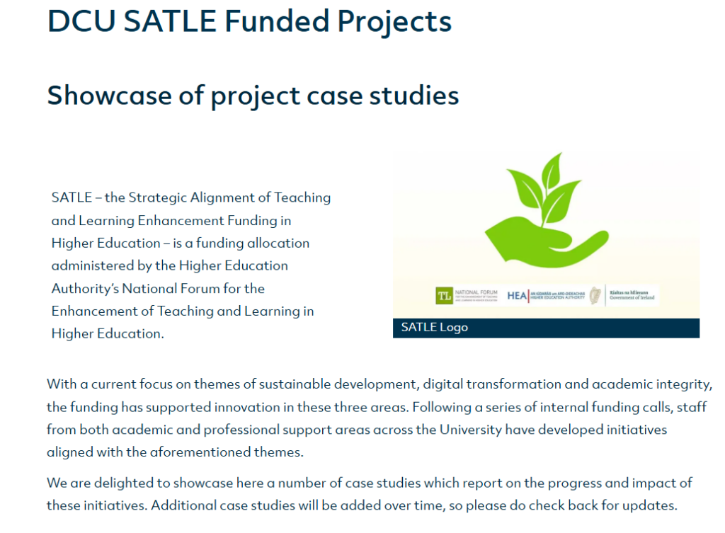 This resource showcases initiatives from both academic and professional support areas across DCU, which have been funded under SATLE – the Strategic Alignment of Teaching and Learning Enhancement Funding in Higher Education. Examples are provided under the themes of Education for Sustainable Development, Digital transformation & Academic Integrity
