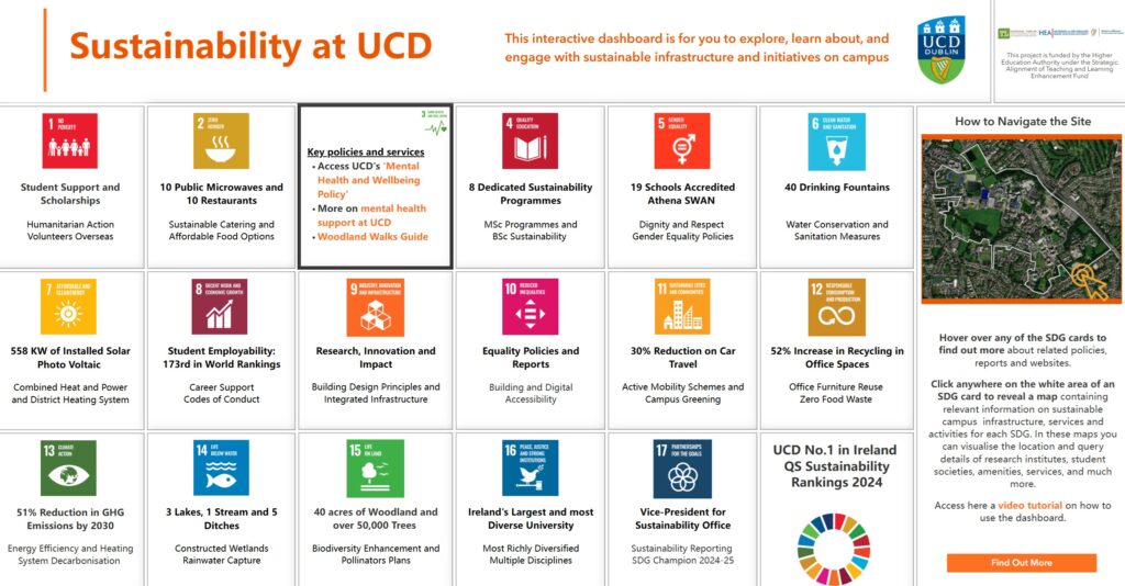 This scientific paper describes the co-creation of the UCD sustainability dashboard – the first transferable template to support geographically-specific SDG monitoring within HEIs. This paper contributes to debates on the need for spatial reporting of actions towards sustainability, to meaningfully recognise local SDG implementation progress.