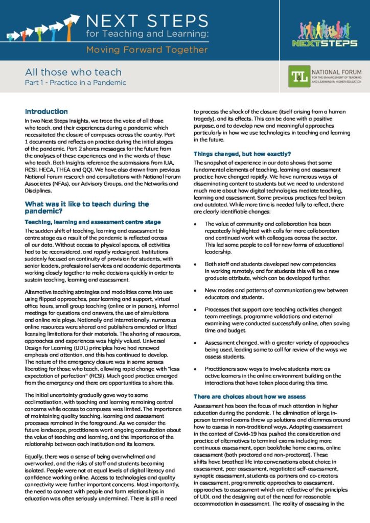 In two Next Steps Insights, we trace the voice of all those who teach, and their experiences during a pandemic which necessitated the closure of campuses across the country. Part 1 documents and reflects on practice during the initial stages of the pandemic. Part 2 shares messages for the future from the analyses of these experiences and in the words of those who teach. Both Insights reference the submissions from IUA, RCSI, HECA, THEA and QQI. We have also drawn from previous National Forum research and consultations with National Forum Associates (NFAs), our Advisory Groups, and the Networks and Disciplines.