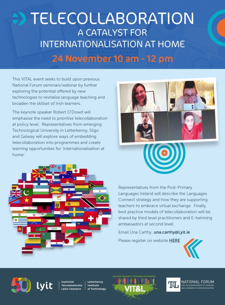 The keynote speaker Robert O’Dowd will emphasise the need to prioritise telecollaboration at policy level. Representatives from emerging Technological University in Letterkenny, Sligo and Galway will explore ways of embedding telecollaboration into programmes and create learning opportunities for ‘internationalisation at home’.