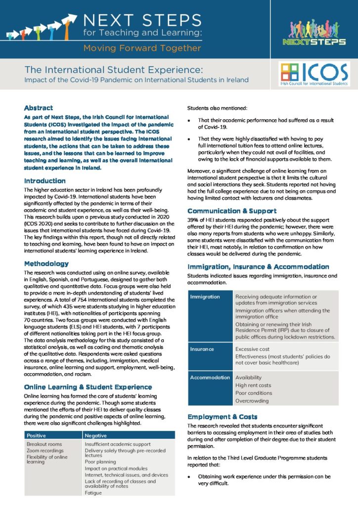 As part of Next Steps, the Irish Council for International Students (ICOS) investigated the impact of the pandemic from an international student perspective. The ICOS research aimed to identify the issues facing international students, the actions that can be taken to address these issues, and the lessons that can be learned to improve teaching and learning, as well as the overall international student experience in Ireland.