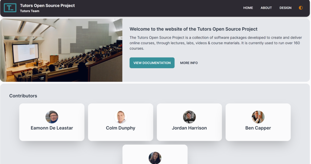 Tutors is an professional and intuitive platform for the creation of compelling educational content. It is open source, well documented and now used by upwards of 160 modules at Waterford Institute of Technology. The platform employs the latest thinking in the production of media-rich web content, with a focus on delivering a simple, easy to navigate, elegant and compelling student experience. A central goal of Tutors is to fostering the sense on an online community of learners. These interactions are promoted by a set of non-intrusive measurements (we call TutorsTime) which help students and educators understand the use of the student’s time on a module.