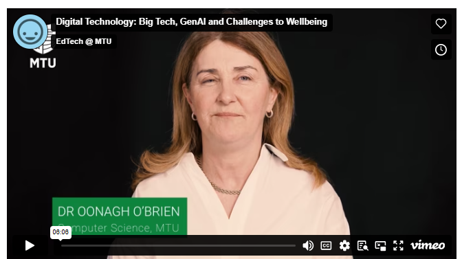 The video examines the impact of digital technology on the wellbeing of children and young people. It highlights ethics and legislation relating to social media platforms and Gen AI. It will be of interest to educators in third level, adult education and older school children. Content warning: it includes references to upsetting examples.