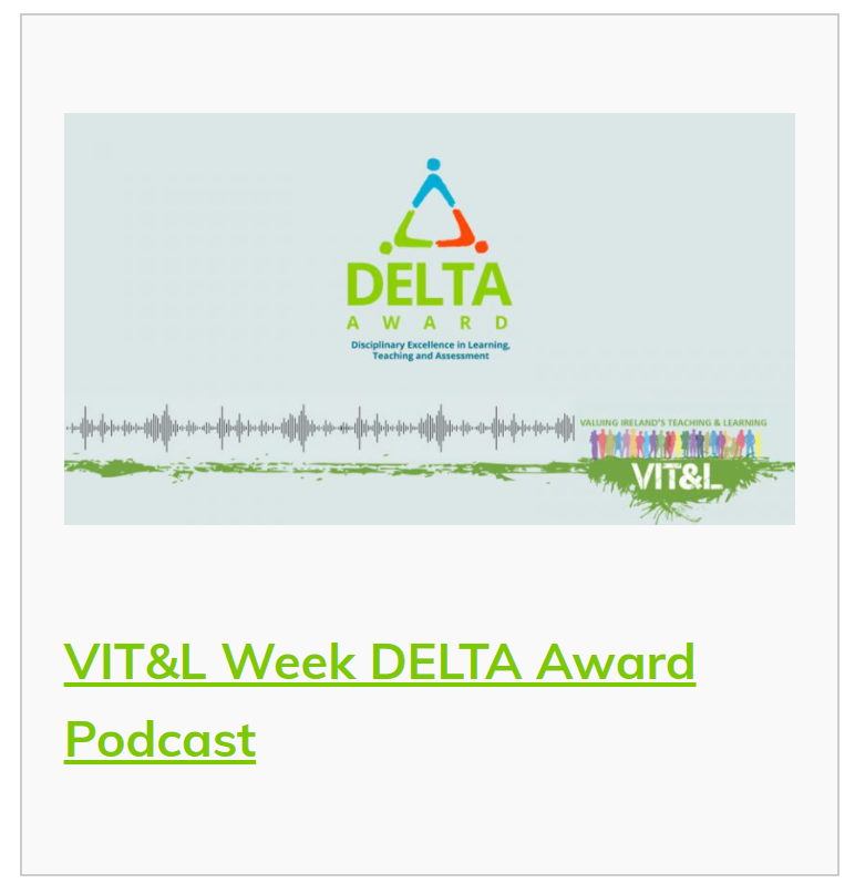 This VIT&L Week podcast focuses on the Disciplinary Excellence in Learning, Teaching and Assessment (DELTA) Award. Dr Roisin Cahalan, UL, Dr Jerry Reen UCC and Dr Helen McGuirk , MTU explore what the DELTA Award means to them and discuss the Award’s importance to the Irish higher education sector.